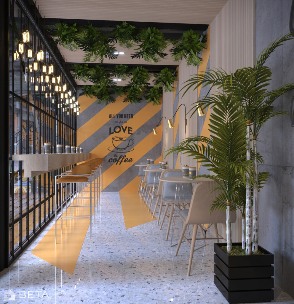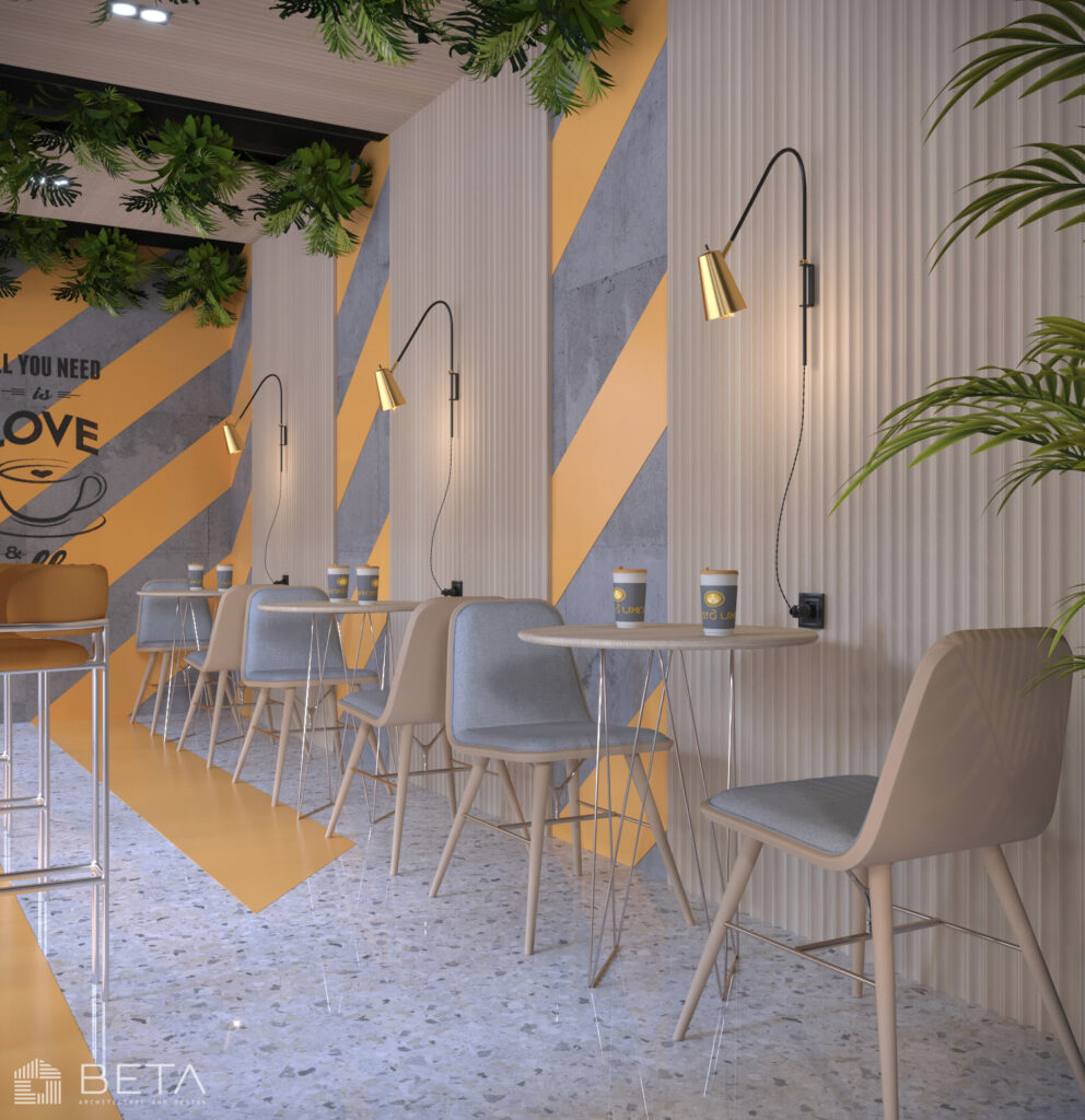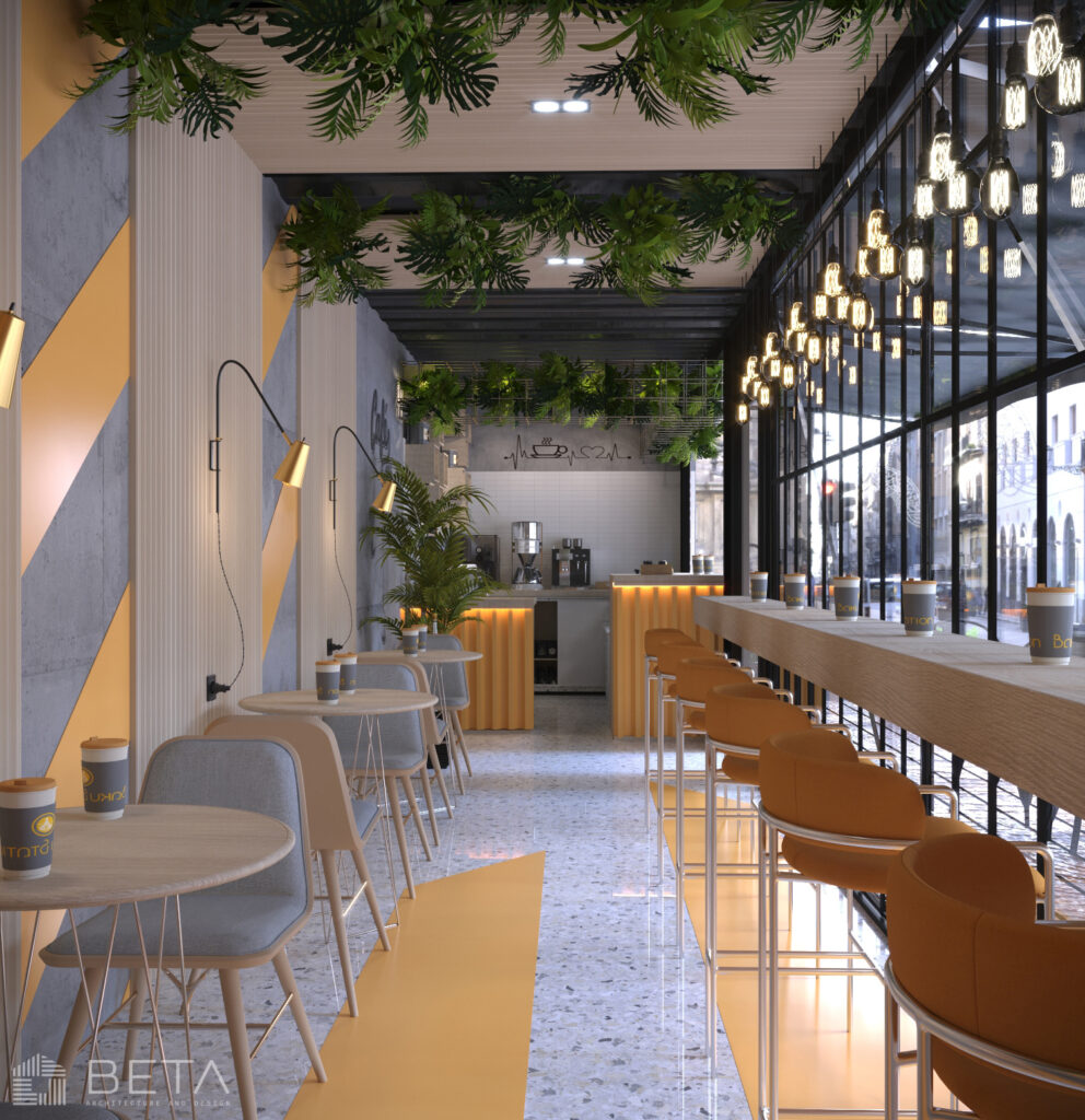 The design of the small urban coffee shop embraces an aesthetic of simplicity and sophistication, with a focus on organic and neutral tones. The color palette of white and gray creates a clean and minimalist atmosphere, allowing the focus to be on the natural elements. Exposed brick walls and raw concrete accents add an industrial touch, while wooden furnishings and live plants bring warmth and a connection to nature. Soft lighting creates a cozy ambiance, inviting patrons to relax and enjoy their artisanal coffee in a tranquil setting. This urban coffee shop design harmoniously blends organic elements with a modern aesthetic, providing a stylish and serene space for coffee lovers to unwind in the heart of the city.